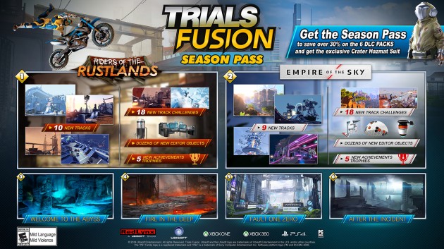 Today, Ubisoft unveiled more details about the Season Pass for Trials Fusion™, the popular platform racer from RedLynx. Trials Fusion downloadable content will start rolling out to players on July 29 with the first of six packs, Riders of the Rustlands. Each pack is available for purchase on its own for $4.99 or all six pieces can be purchased as part of the Trials Fusion Season Pass for $19.99, a discount of more than 30 percent. Additionally, Season Pass purchasers will also receive the Crater Hazmat Suit, a piece of exclusive rider gear.