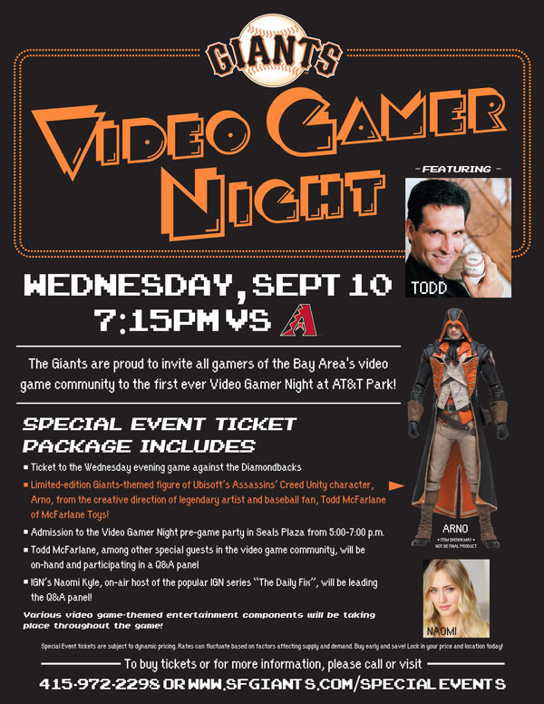 Ubisoft and McFarlane Toys are proud community partners and participants of the San Francisco Giants’ first ever Video Gamer Night at AT&T Park on September 10. This special event welcomes gamers to attend a Giants game versus the Arizona Diamondbacks, and includes admission to the Video Gamer Night pre-game party in Seals Plaza from 5:00-7:00 pm, as well as an exclusive limited-edition Giants-themed Assassin’s Creed figure from Todd McFarlane.